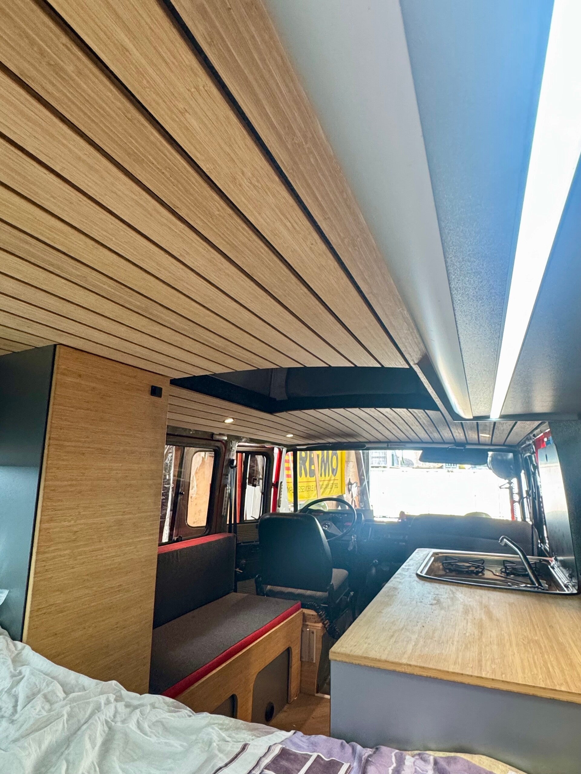 Om zelfvoorzienend te zijn, hebben we zonnepanelen op het hefdak gemonteerd. Daarna zijn we doorgegaan met het isoleren van de bus en het aanbrengen van alle bedrading. Vervolgens hebben we de wanden gestoffeerd en een interieur op maat gemaakt met bamboepanelen en populieren HPL beplakte meubelplaten.